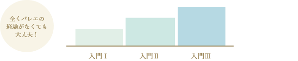 年齢別のクラスに合流する前に、ちゃんと入門1~Ⅲでゆっくりと丁寧にバレエの基本をレッスンします。