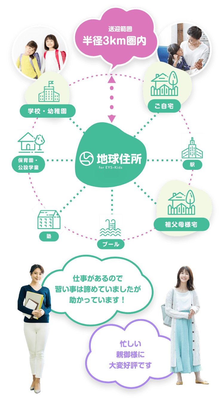仕事があるので習い事は諦めていましたが助かっています! 学校・幼稚園 駅 ご自宅 祖父母様宅 プール 塾 保育園・公設学童 「送迎範囲 半径3km圏内」 地球住所 for EYS-Kids
