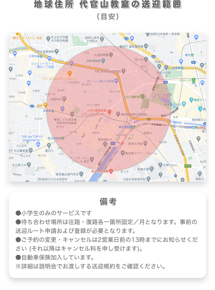 地球住所 代官山教室の送迎範囲(目安) 「忙しい親御様に大変好評です」 備考 ●小学生のみのサービスです●待ち合わせ場所は往路・復路各一箇所固定/月となります。事前の送迎ルート申請および登録が必要となります。●ご予約の変更・キャンセルは2営業日前の13時までにお知らせください (それ以降はキャンセル料を申し受けます)。●自動車保険加入しています。※詳細は説明会でお渡しする送迎規約をご確認ください。